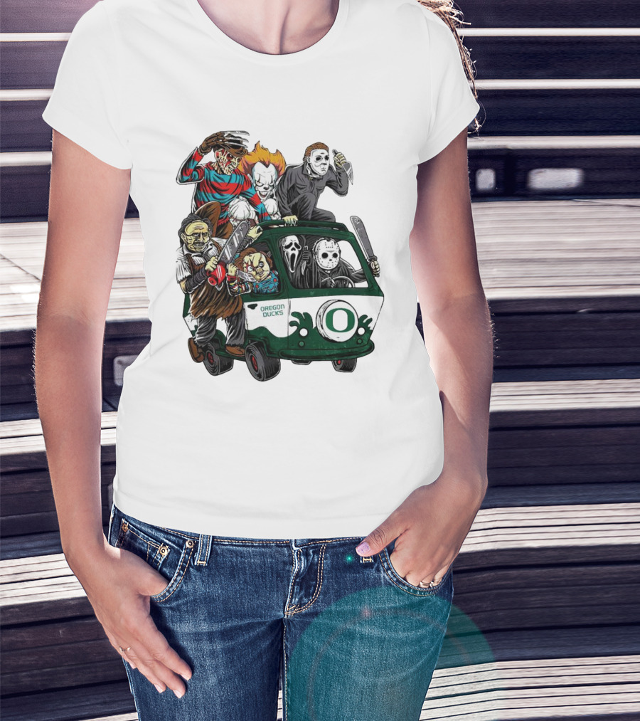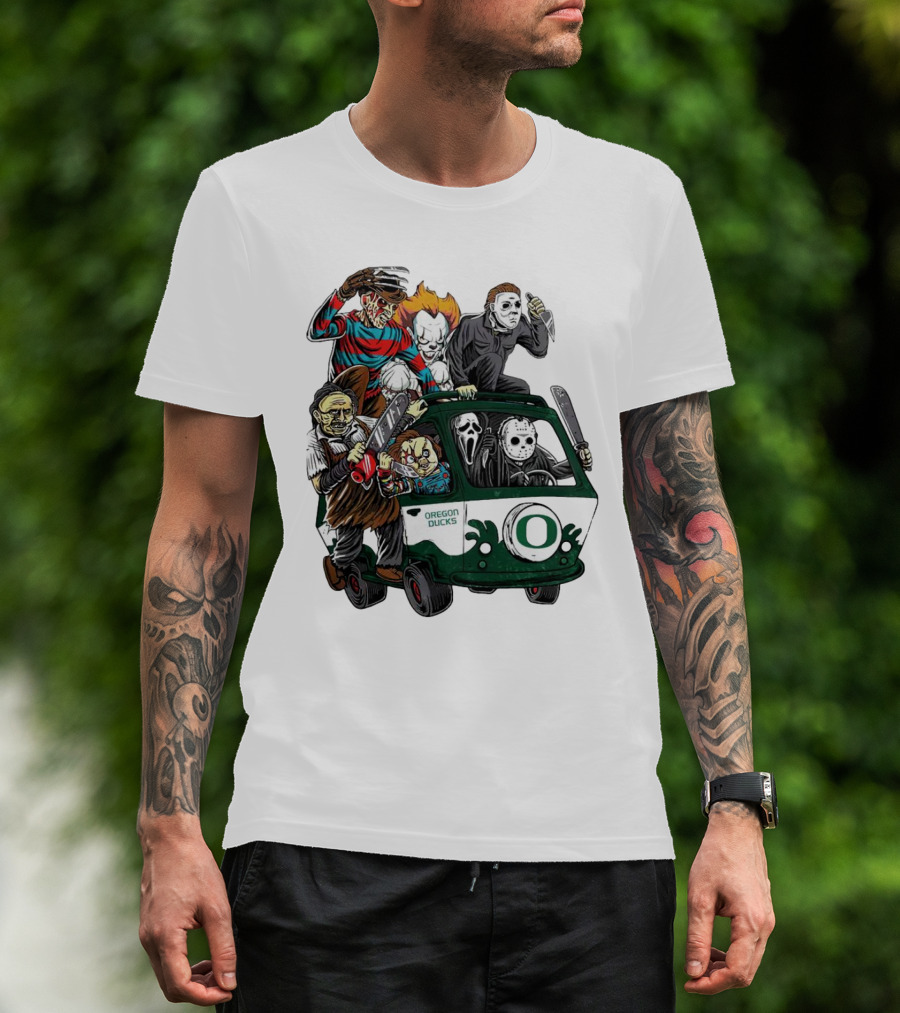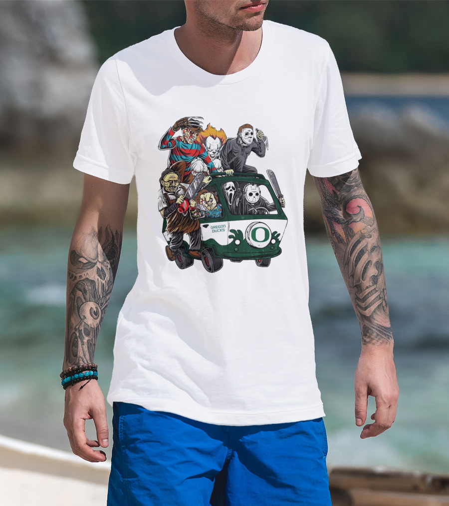 Oregon Ducks Horror Characters Bus Halloween Freddy Jason Michael Myers Pennywise Mask T-Shirt