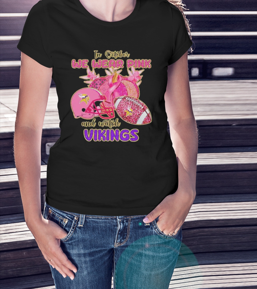 In October We Wear Pink And Watch Vikings Football Helmets Breast Cancer Awareness T-Shirt
