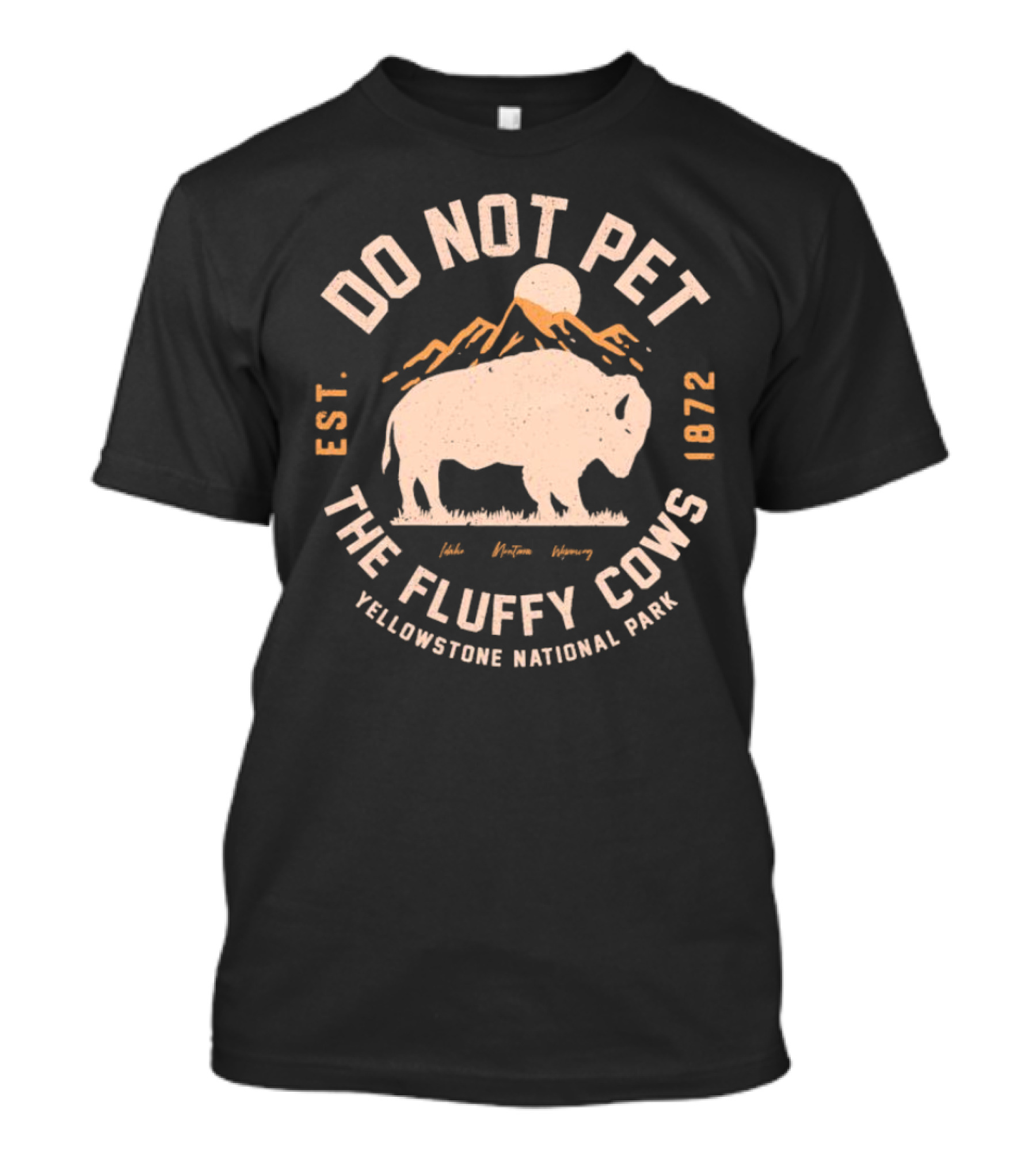 The Do Not Pet the Fluffy Cows Yellowstone National Park Est 1872 Idaho Montana Wyoming T-shirt is designed for everyday wear and a consistent fit. Fabric is pre-shrunk ring-spun cotton with durable stitching. See the size chart below for exact measurements.