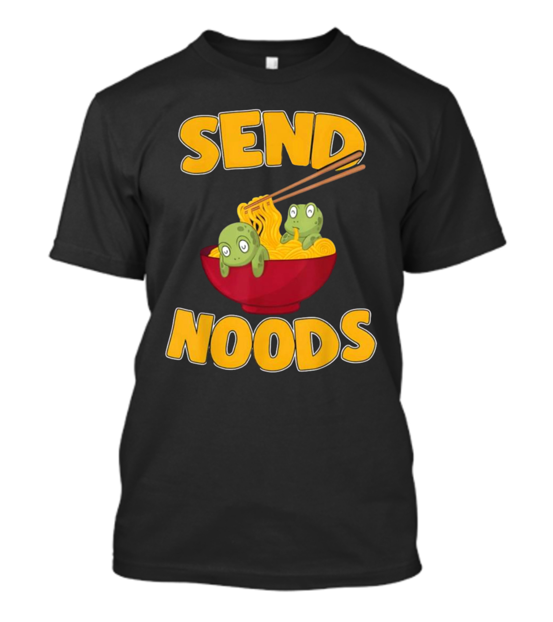 The Send Noods Funny Ramen with Turtles T-shirt is designed for everyday wear and a consistent fit. Fabric is pre-shrunk ring-spun cotton with durable stitching. See the size chart below for exact measurements.