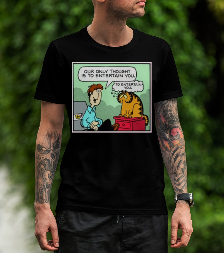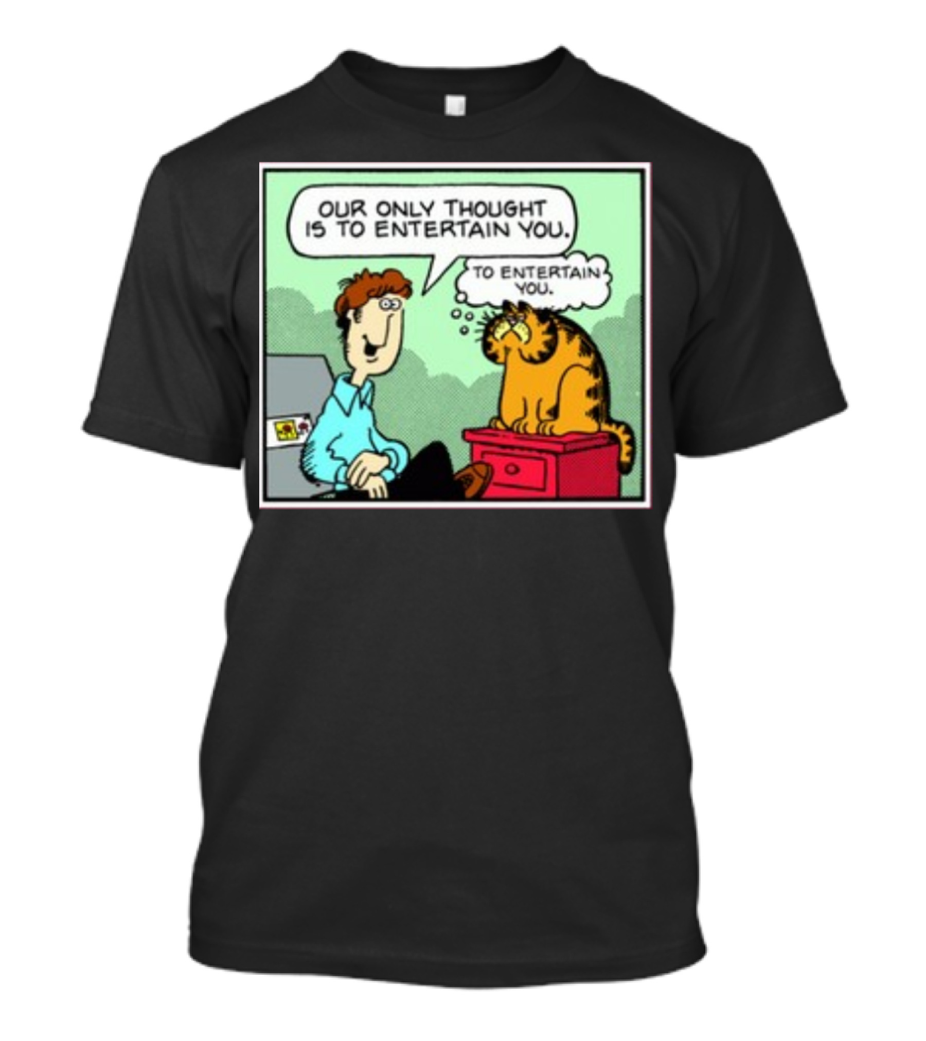 The Quinton Reviews Our Only Thought Is To Entertain You Cartoon Cat Humorous Speech Bubble T-shirt is designed for everyday wear and a consistent fit. Fabric is pre-shrunk ring-spun cotton with durable stitching. See the size chart below for exact measurements.