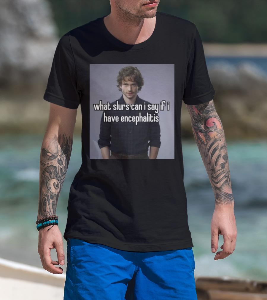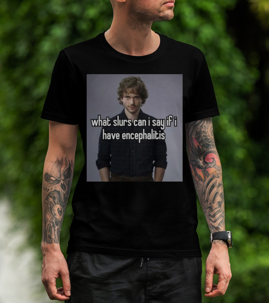 What Slurs Can I Say If I Have Encephalitis Text On Image Of Man With Curly Hair T-Shirt