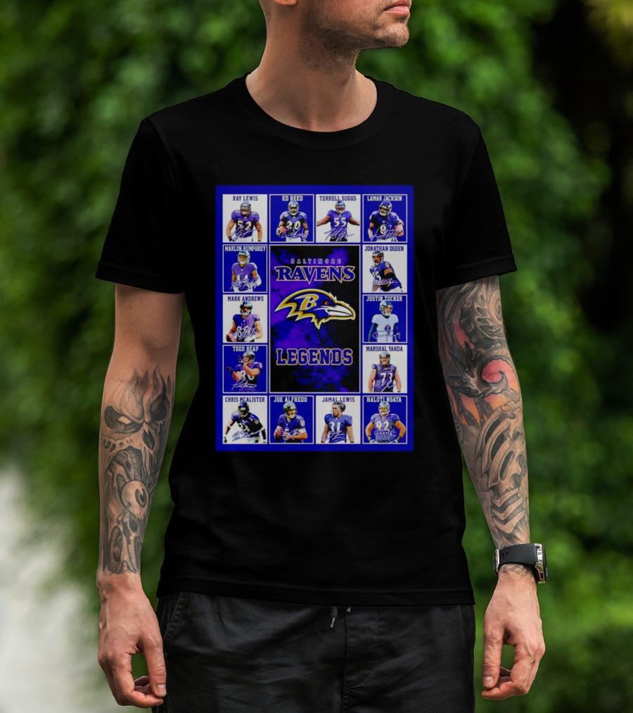Baltimore Ravens Legends Ray Lewis Ed Reed Lamar Jackson Signature Collection T-Shirt