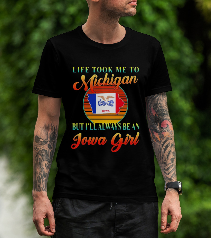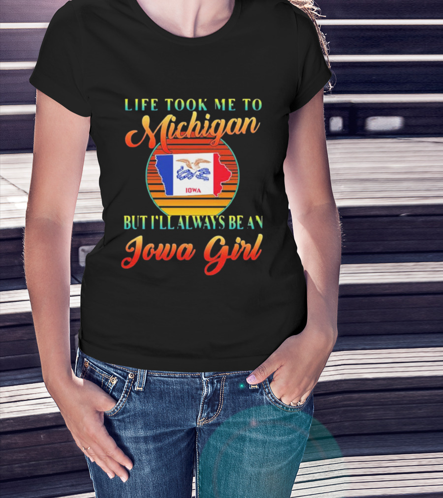 Life Took Me To Michigan But I'll Always Be An Iowa Girl Vintage Iowa Map Flag T-Shirt