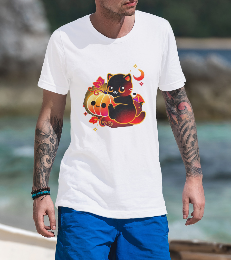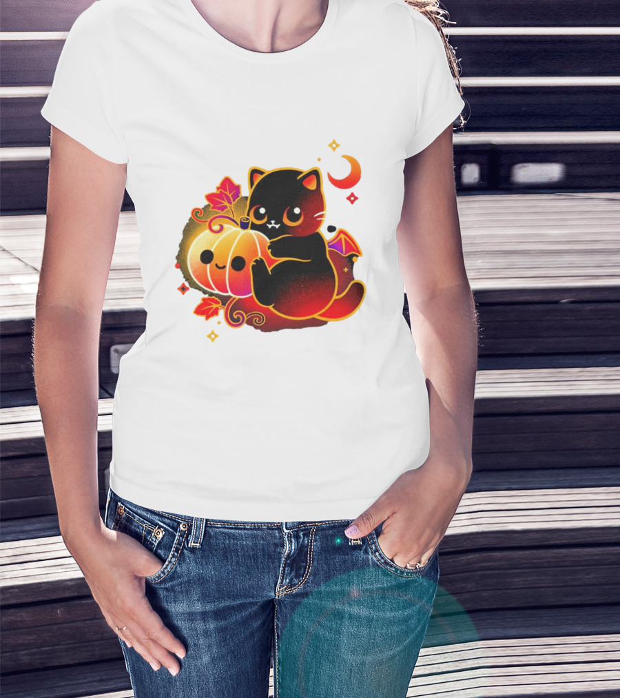 Cat Demon Halloween Moon Pumpkin Leaves Bat Wings T-Shirt