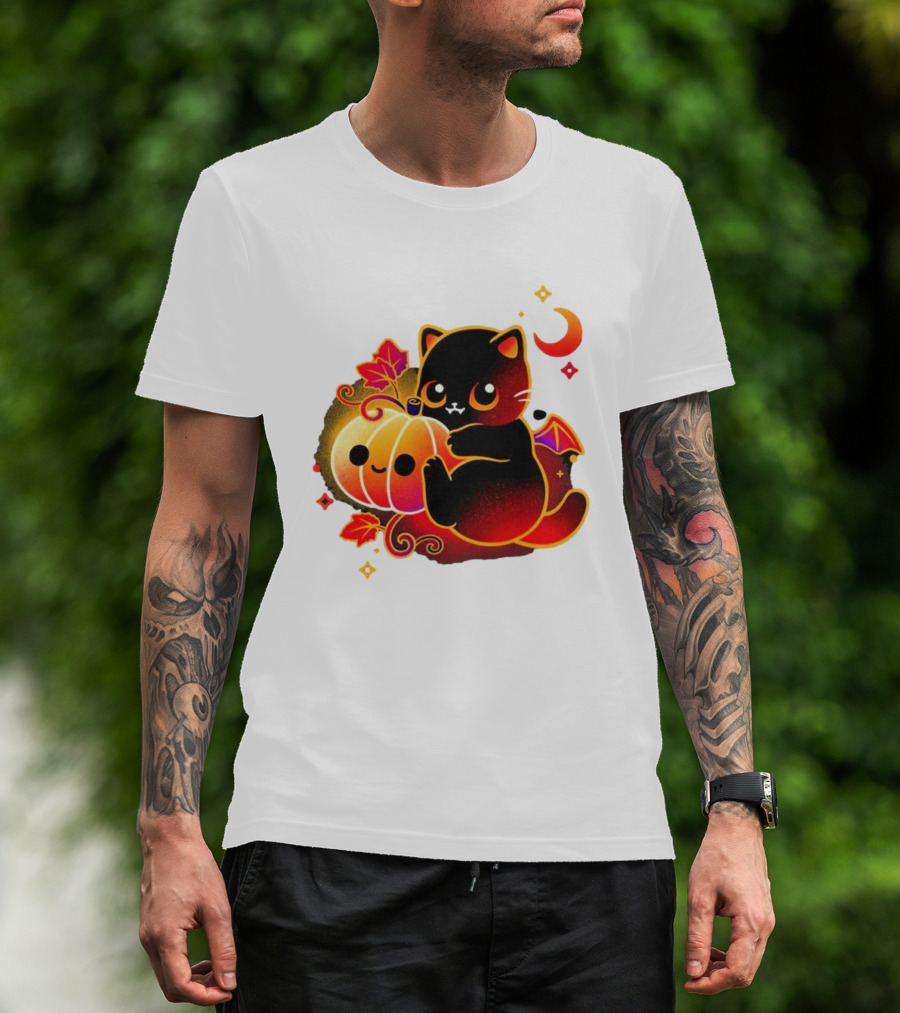 The Cat Demon Halloween Moon Pumpkin Leaves Bat Wings T-shirt is designed for everyday wear and a consistent fit. Fabric is pre-shrunk ring-spun cotton with durable stitching. See the size chart below for exact measurements.