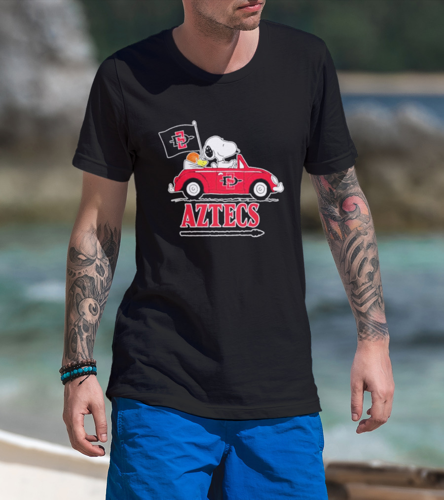 Snoopy And Woodstock Riding In Red Car With Aztecs Flag T-Shirt