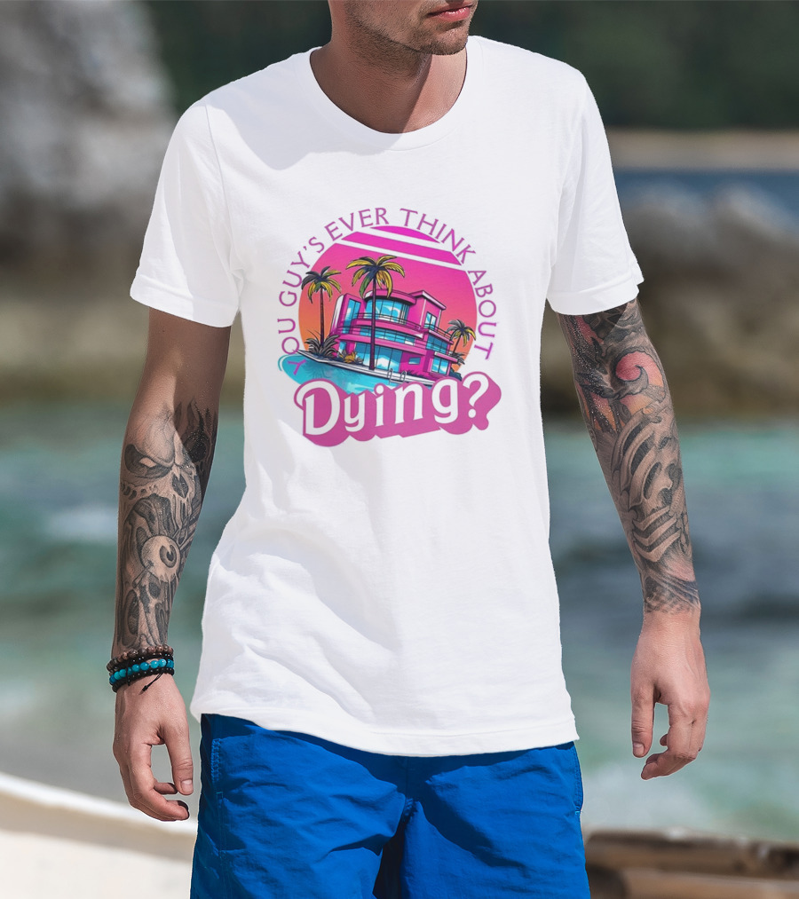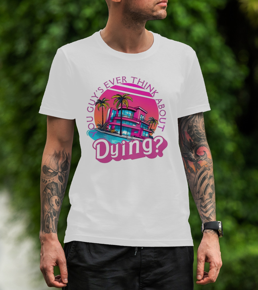 The You Guy's Ever Think About Dying? Retro Palm Tree Sunset Vibrant Pink Neon Aesthetic T-shirt is designed for everyday wear and a consistent fit. Fabric is pre-shrunk ring-spun cotton with durable stitching. See the size chart below for exact measurements.