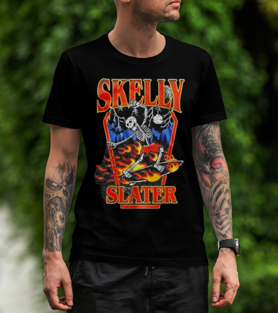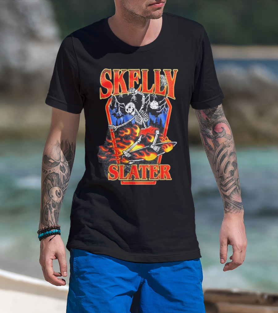 Skelly Slater Skeleton Skateboarding With Flames And Coffin Background T-Shirt