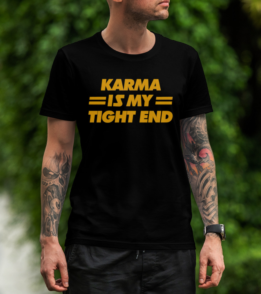 The Karma Is My Tight End T-shirt is designed for everyday wear and a consistent fit. Fabric is pre-shrunk ring-spun cotton with durable stitching. See the size chart below for exact measurements.