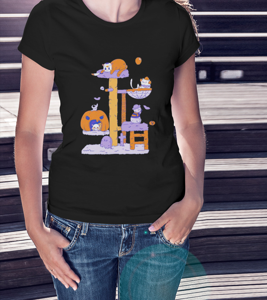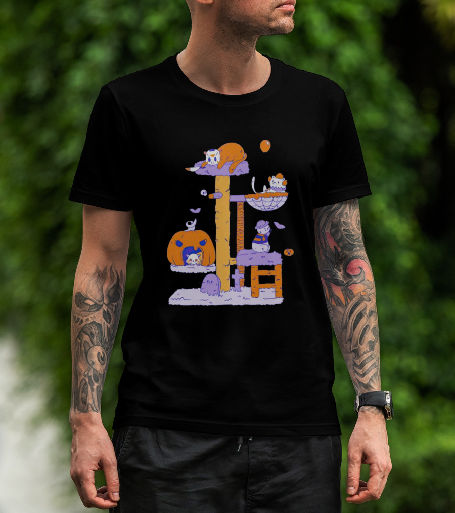 Cats In Halloween Horror Cosplay Playground With Pumpkins And Ghosts T-Shirt