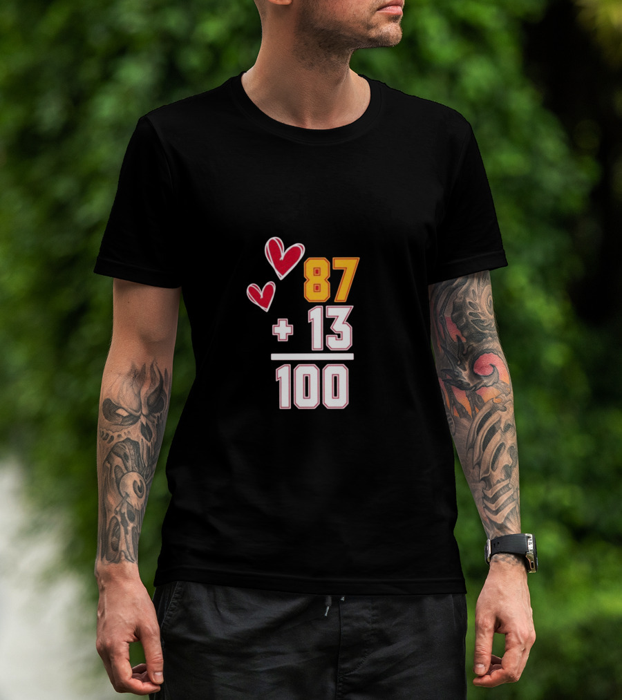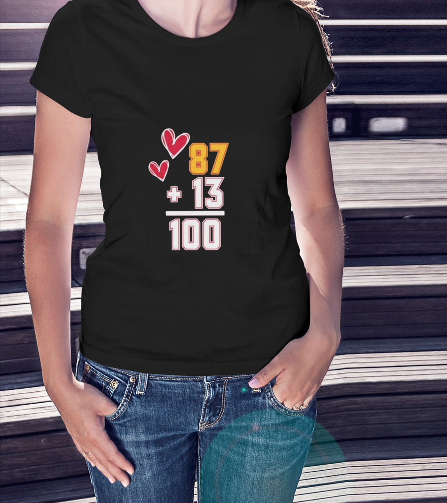 The 87 + 13 = 100 Love Hearts T-shirt is designed for everyday wear and a consistent fit. Fabric is pre-shrunk ring-spun cotton with durable stitching. See the size chart below for exact measurements.
