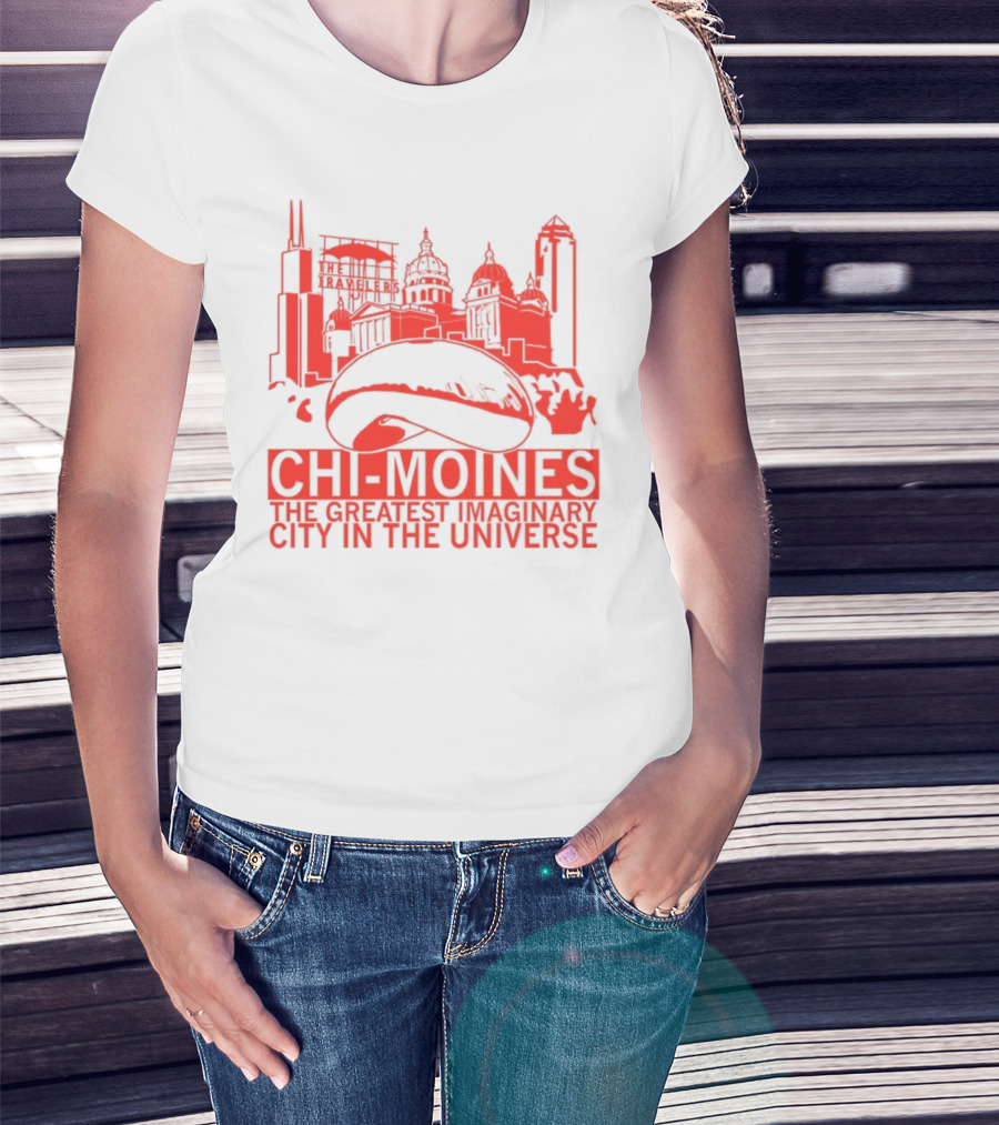 Chi-Moines The Greatest Imaginary City In The Universe Featuring Iconic Red Skyline With Bean And Traveller's Building T-Shirt