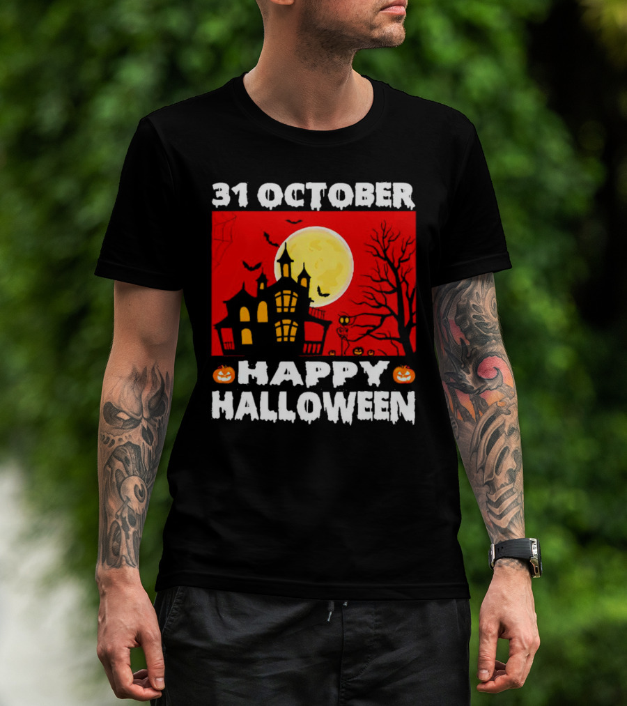 31 October Happy Halloween Haunted House Full Moon Pumpkins Bats Spooky Tree T-Shirt