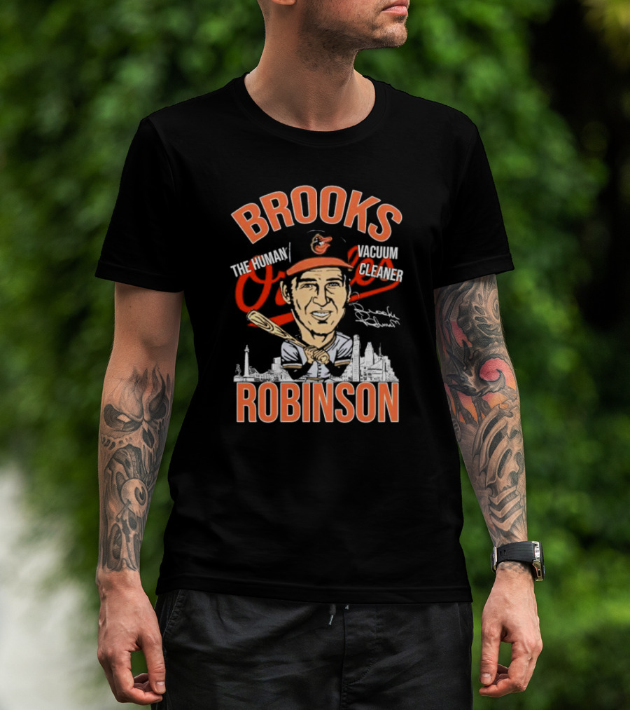 Brooks Robinson The Human Vacuum Cleaner Caricature Signature Orioles Baseball Legend Baltimore Skyline T-Shirt