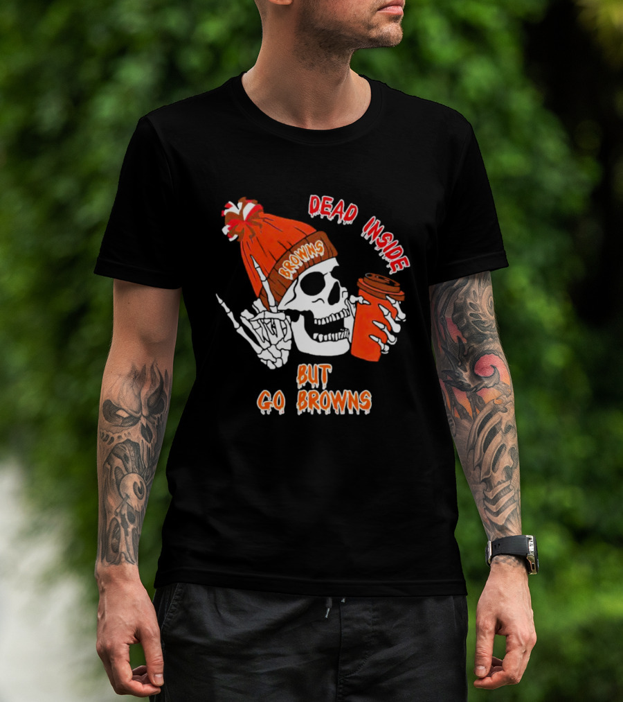 Dead Inside But Go Browns Skeleton With Coffee And Beanie T-Shirt