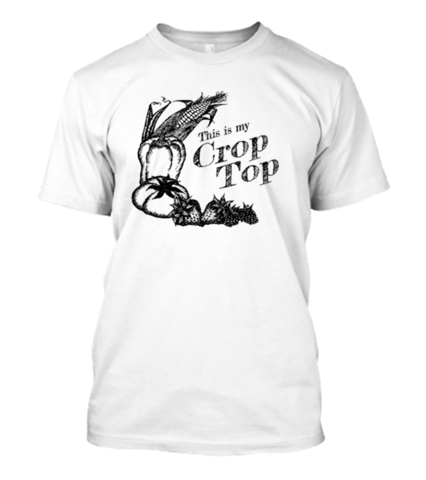 The This Is My Crop Top Vegetables Peppers Corn Strawberries Typography T-shirt is designed for everyday wear and a consistent fit. Fabric is pre-shrunk ring-spun cotton with durable stitching. See the size chart below for exact measurements.