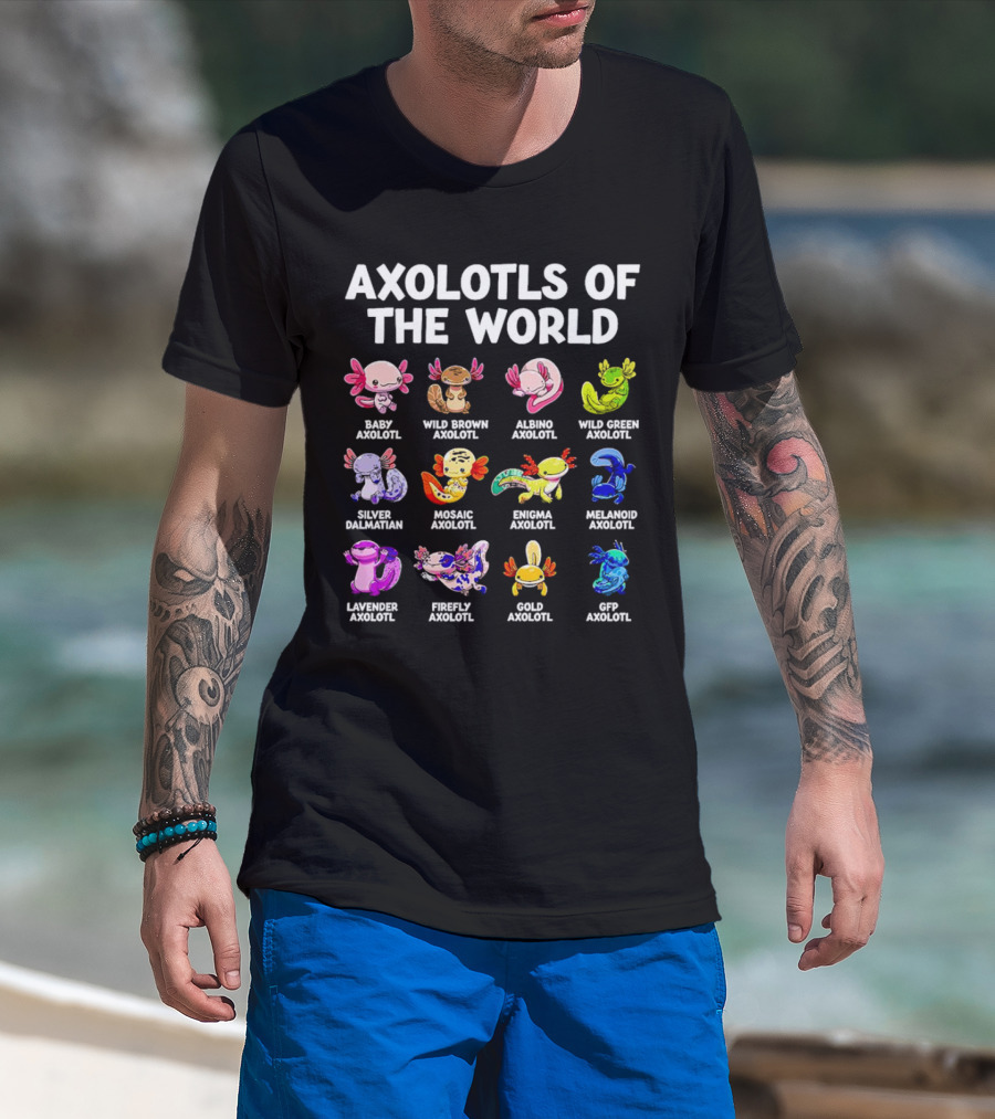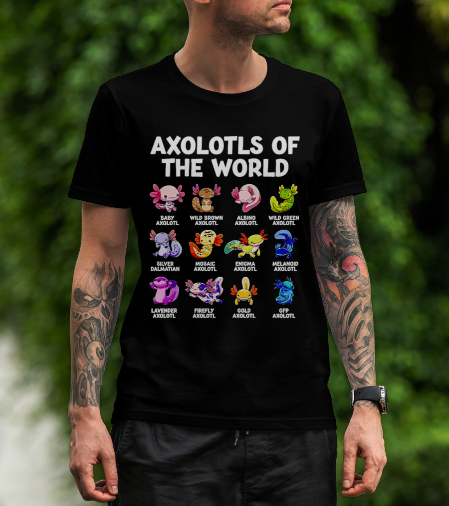 AXOLOTLS OF THE WORLD BABY WILD BROWN ALBINO GREEN SILVER MOSAIC ENIGMA MELANOID LAVENDER FIREFLY GOLD GFP AXOLOTL T-Shirt