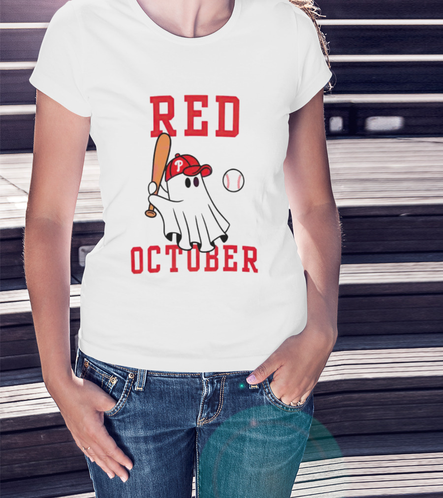 Phillies Red October Ghost Baseball Player In Cap And Bat T-Shirt