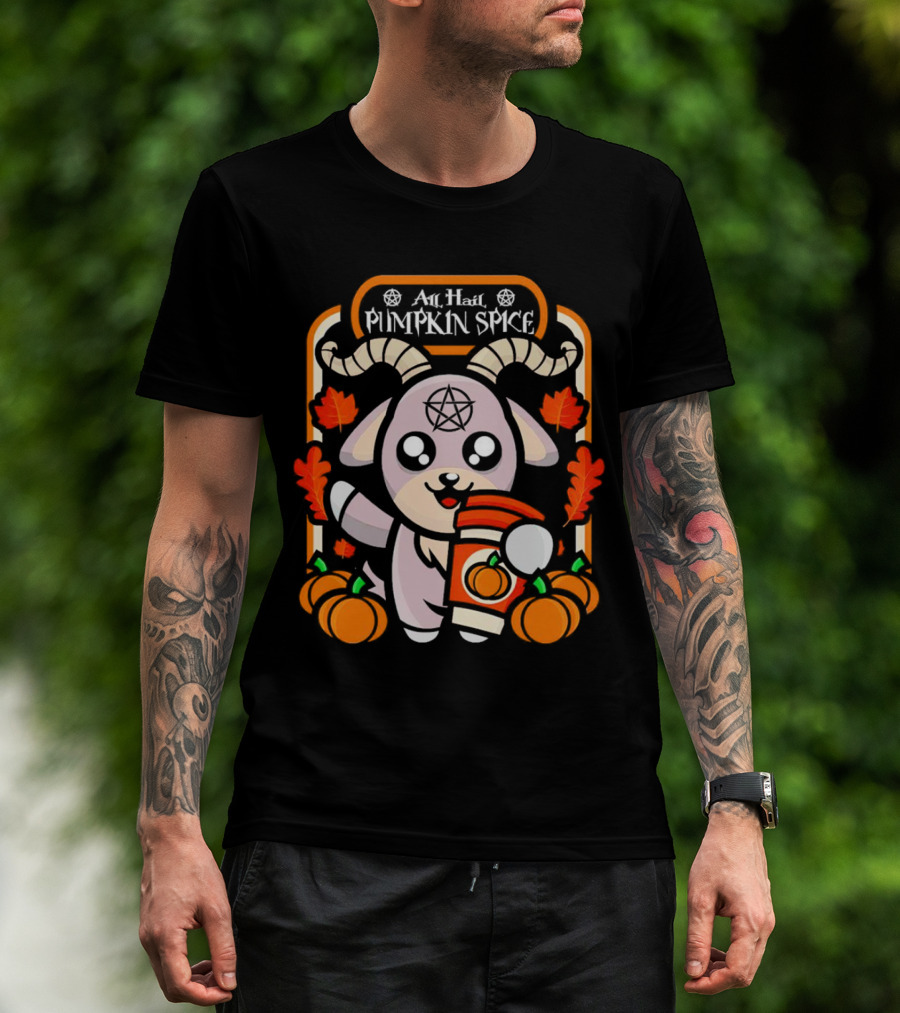 All Hail Pumpkin Spice Halloween Goat With Coffee, Pumpkins, And Pentagram T-Shirt
