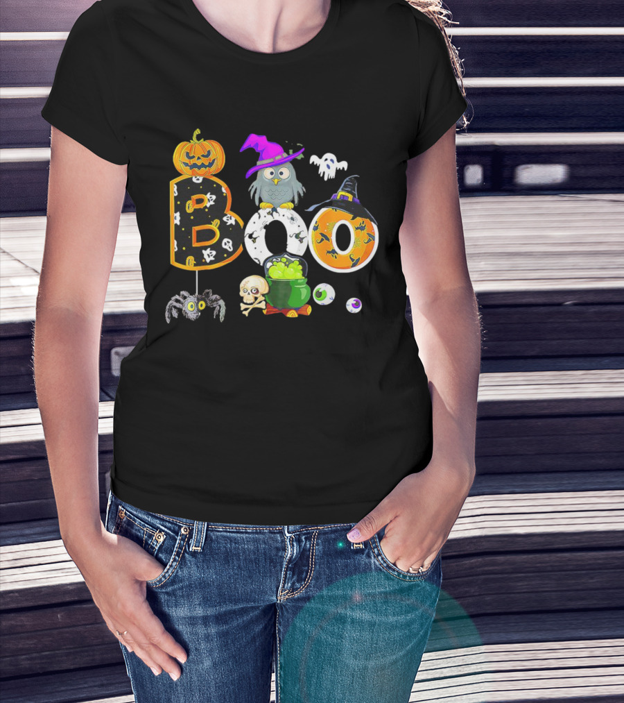 Boo Pumpkin Ghost Skull Owl Spider Witch Hat Cauldron Halloween T-Shirt