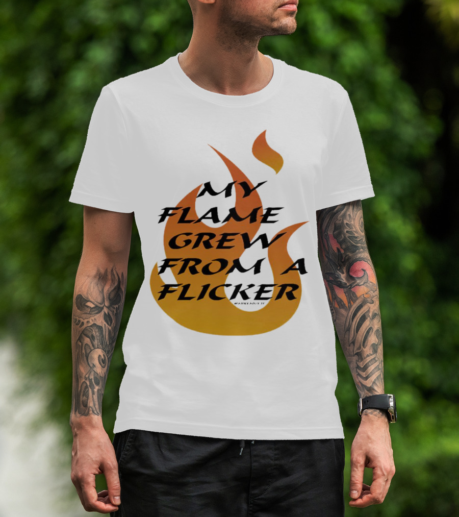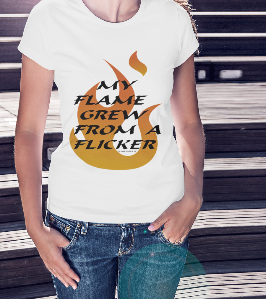 The My Flame Grew from a Flicker Fire T-shirt is designed for everyday wear and a consistent fit. Fabric is pre-shrunk ring-spun cotton with durable stitching. See the size chart below for exact measurements.