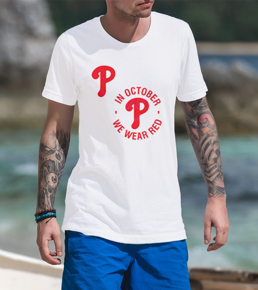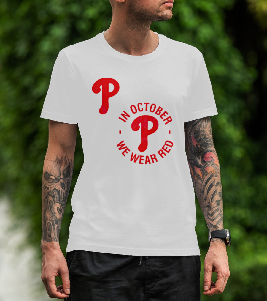 The Phillies P Logo In October We Wear Red T-shirt is designed for everyday wear and a consistent fit. Fabric is pre-shrunk ring-spun cotton with durable stitching. See the size chart below for exact measurements.