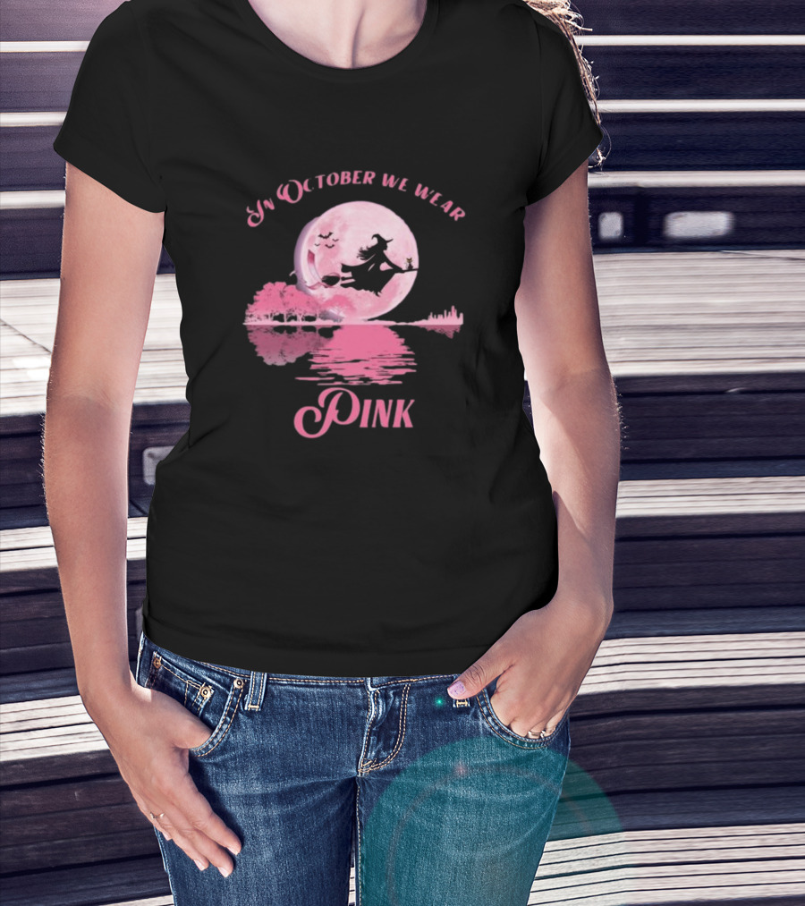 In October We Wear Pink Witch Halloween Moon Breast Cancer Awareness T-Shirt