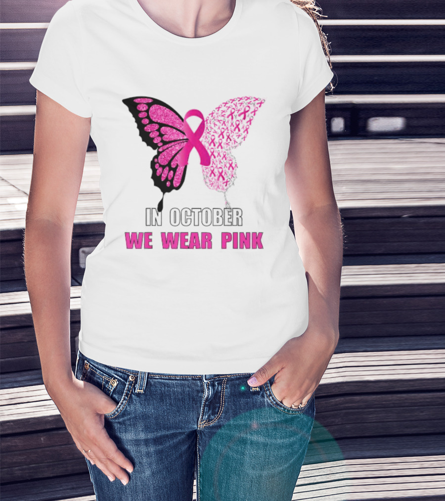 In October We Wear Pink Butterfly Ribbon Breast Cancer Awareness T-Shirt