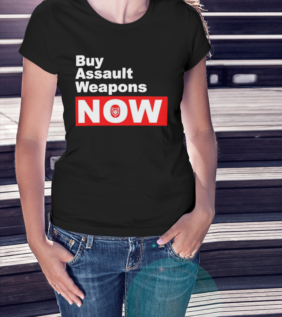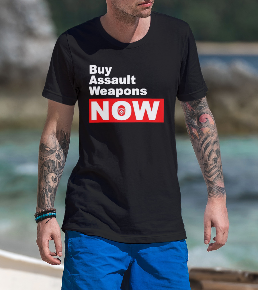 The Buy Assault Weapons Now T-shirt is designed for everyday wear and a consistent fit. Fabric is pre-shrunk ring-spun cotton with durable stitching. See the size chart below for exact measurements.