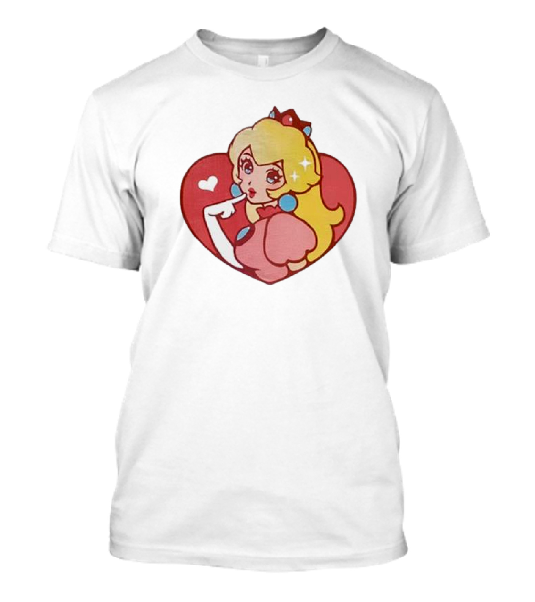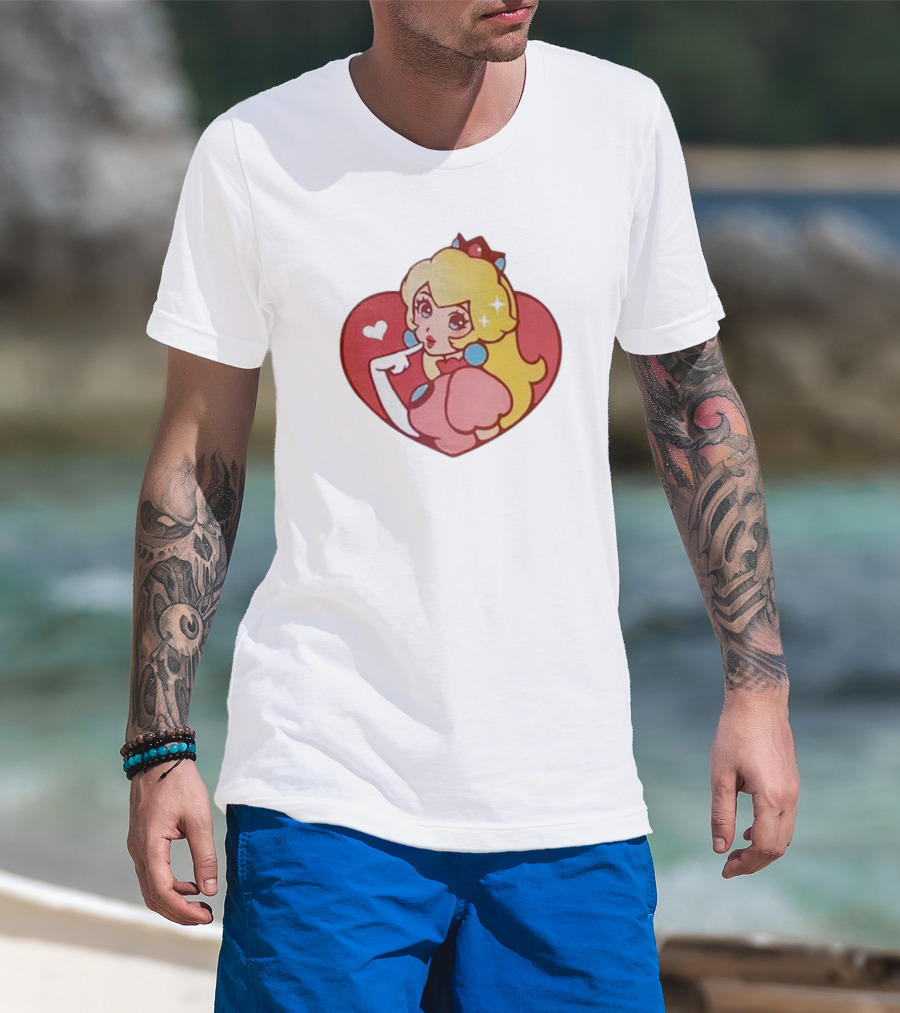 The Princess Peach Heart T-shirt is designed for everyday wear and a consistent fit. Fabric is pre-shrunk ring-spun cotton with durable stitching. See the size chart below for exact measurements.