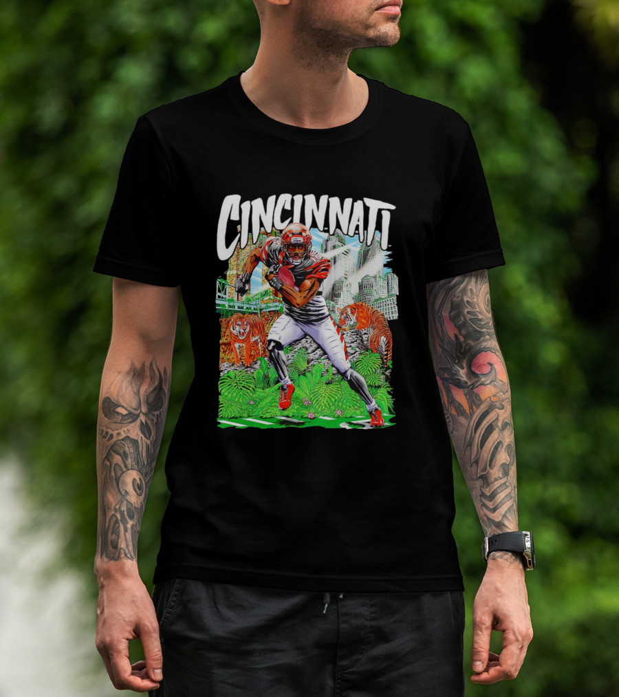 The Cincinnati Bengals A.J. Green Cartoon Vintage Tigers Background T-shirt is designed for everyday wear and a consistent fit. Fabric is pre-shrunk ring-spun cotton with durable stitching. See the size chart below for exact measurements.