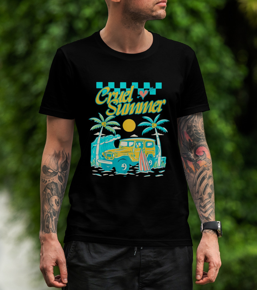 The Cruel Summer Beach Vintage Jeep Palm Trees Retro Sun Wave Heart T-shirt is designed for everyday wear and a consistent fit. Fabric is pre-shrunk ring-spun cotton with durable stitching. See the size chart below for exact measurements.