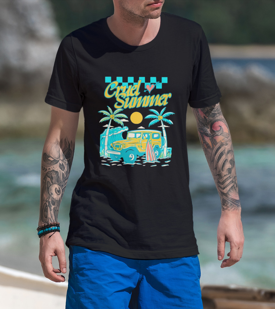 Cruel Summer Beach Vintage Jeep Palm Trees Retro Sun Wave Heart T-Shirt
