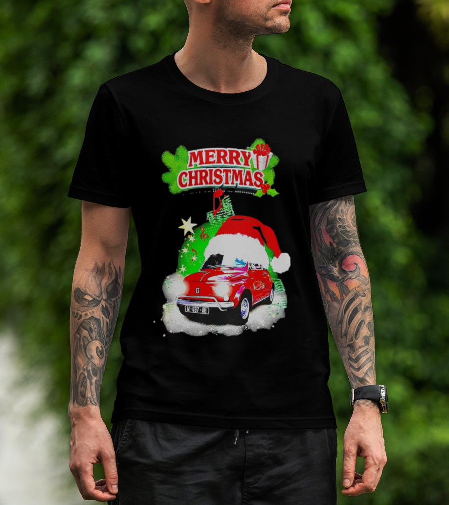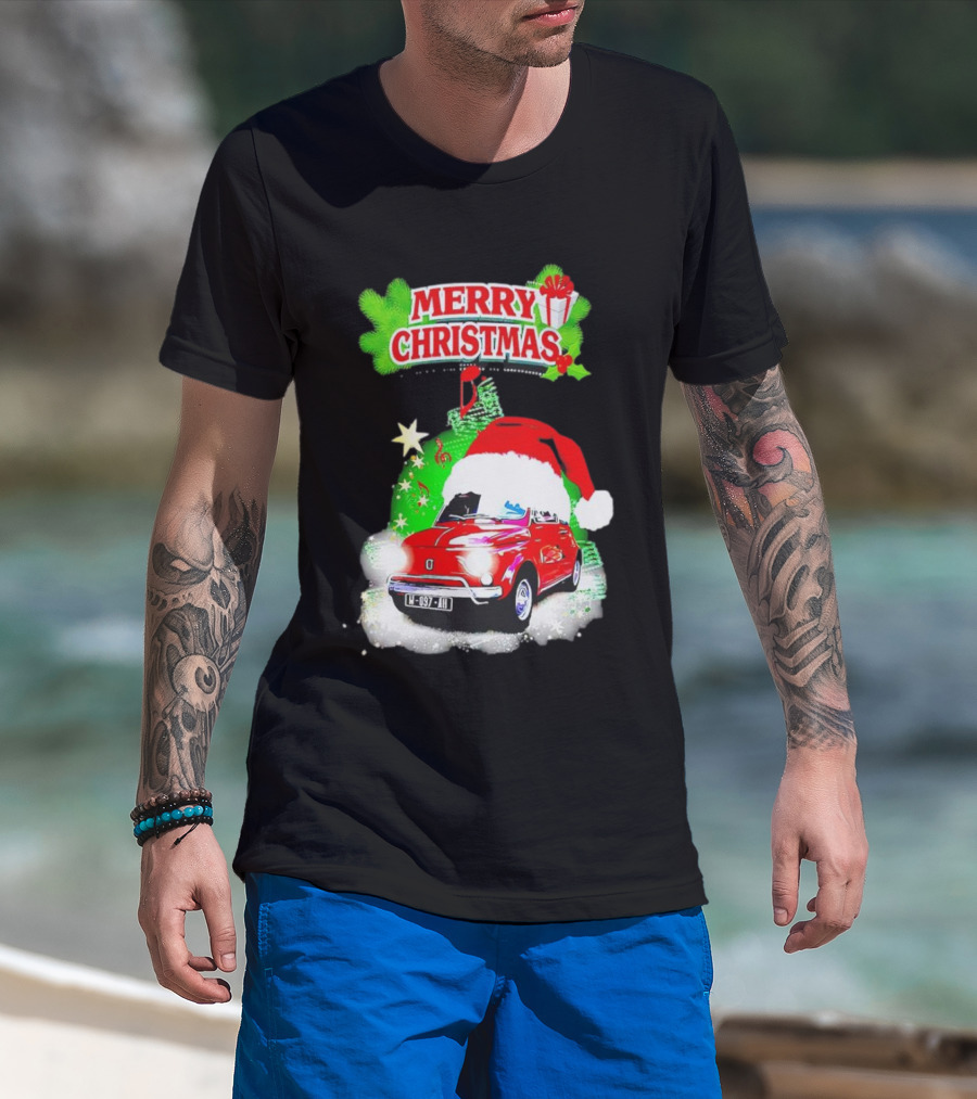 Merry Christmas Red Fiat 500 With Santa Hat And Green Background T-Shirt