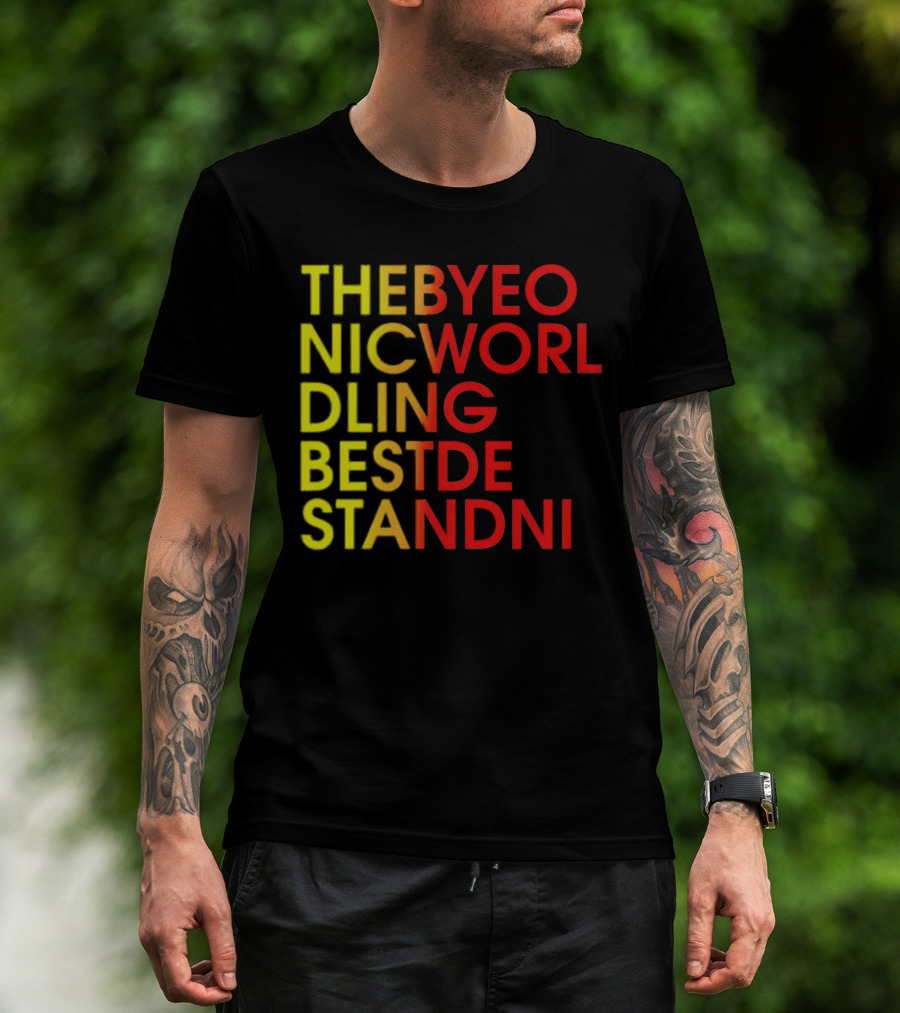 The THEBYEO NICWORL DLING BESTDE STANDNI T-shirt is designed for everyday wear and a consistent fit. Fabric is pre-shrunk ring-spun cotton with durable stitching. See the size chart below for exact measurements.