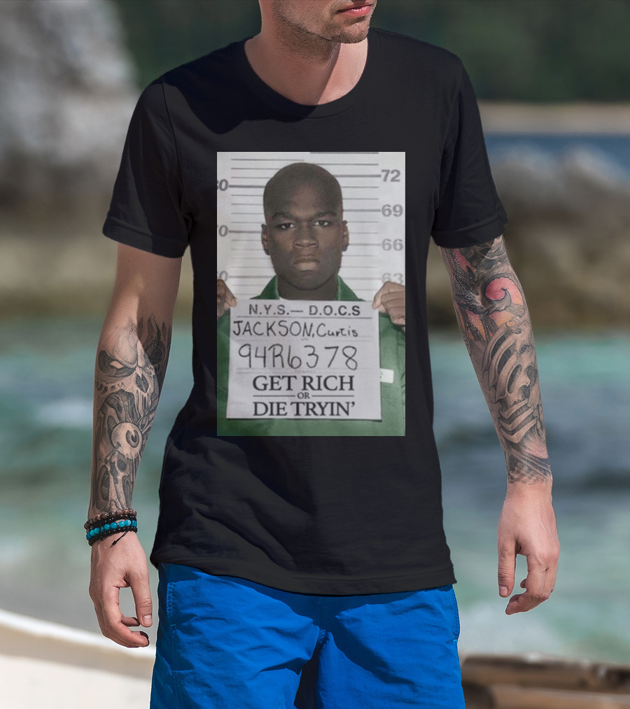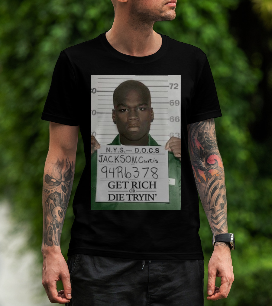 The Curtis Jackson Get Rich Or Die Tryin' Mugshot 94R6378 T-shirt is designed for everyday wear and a consistent fit. Fabric is pre-shrunk ring-spun cotton with durable stitching. See the size chart below for exact measurements.