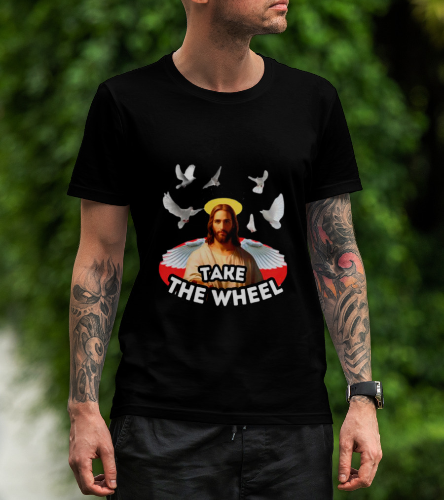 The Jesus Take the Wheel with Dove T-shirt is designed for everyday wear and a consistent fit. Fabric is pre-shrunk ring-spun cotton with durable stitching. See the size chart below for exact measurements.