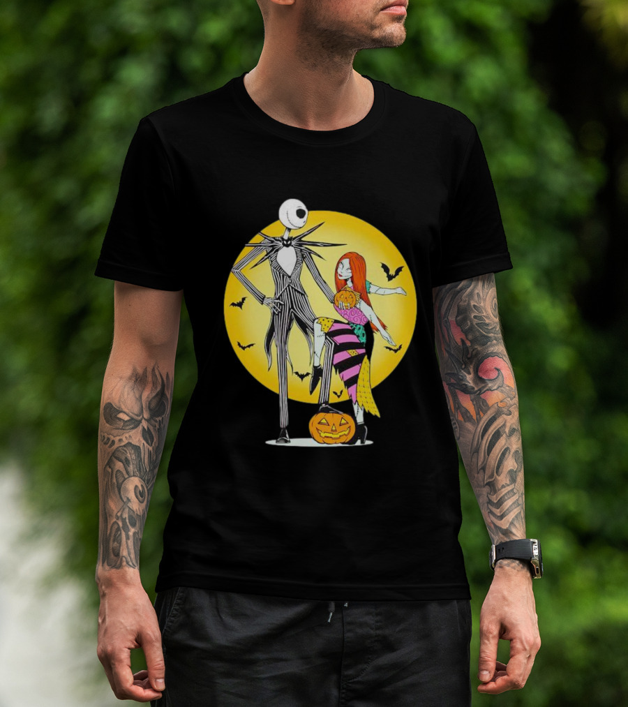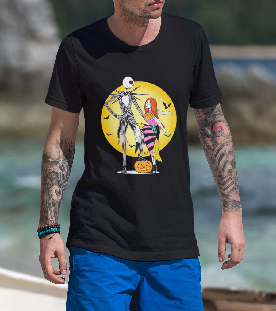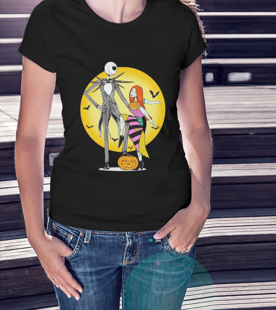 Jack And Sally Halloween Pumpkin Scene With Bats In The Nightmare Before Rumours T-Shirt