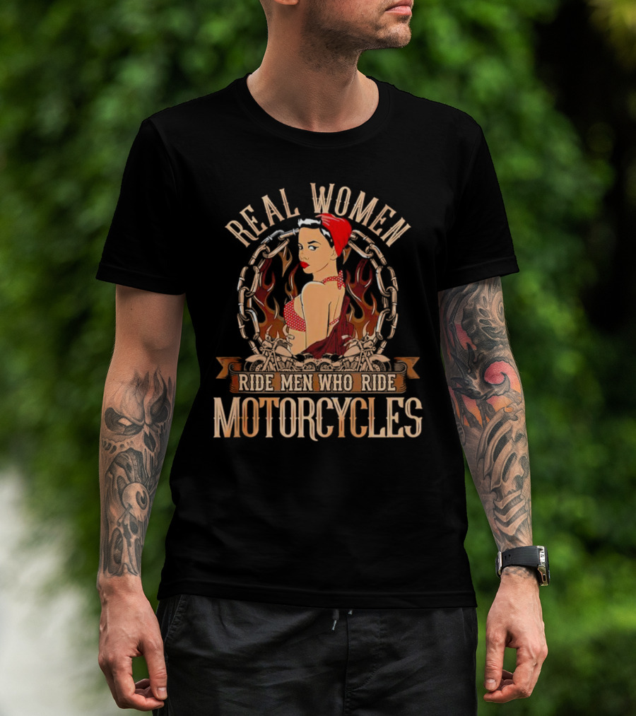 REAL WOMEN RIDE MEN WHO RIDE MOTORCYCLES VINTAGE BIKER PIN-UP WITH FLAMES AND CHAINS T-Shirt