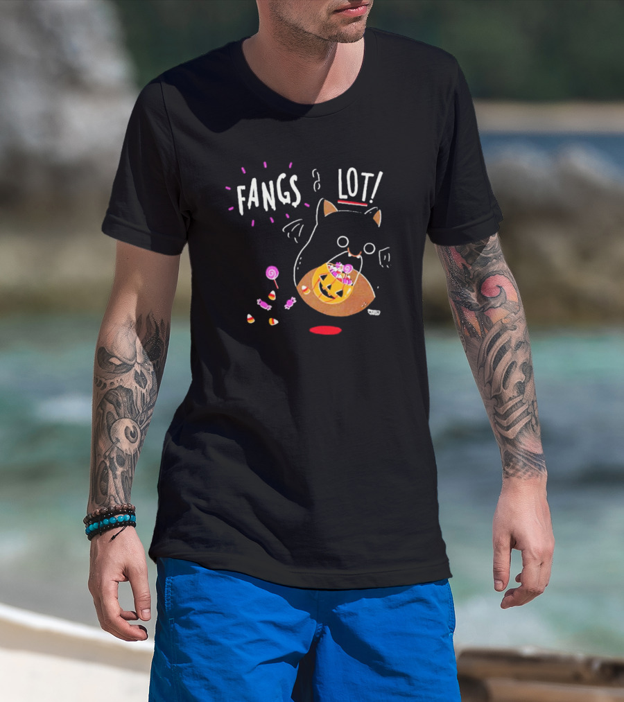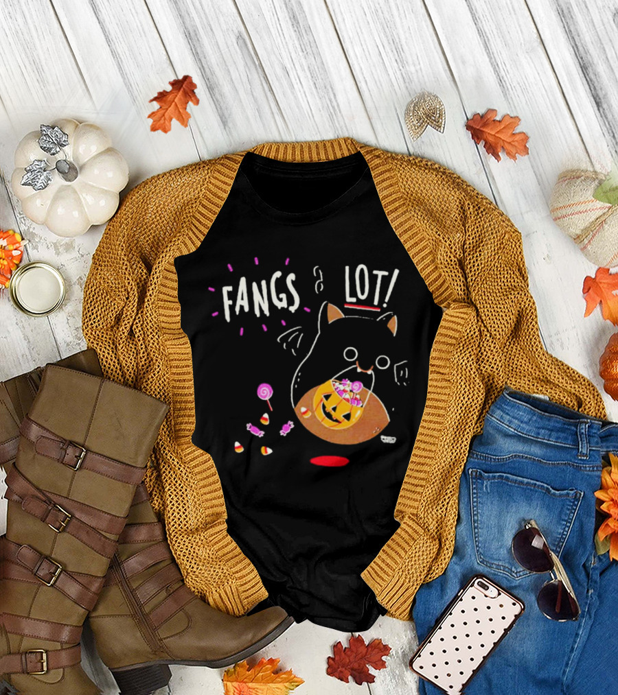 Fangs A Lot Cat With Halloween Candy And Jack-O'-Lantern T-Shirt