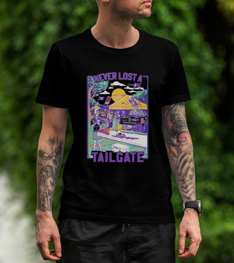 Never Lost A Tailgate Vintage Skeletons Under Yellow Tent With Sunset And Flags T-Shirt