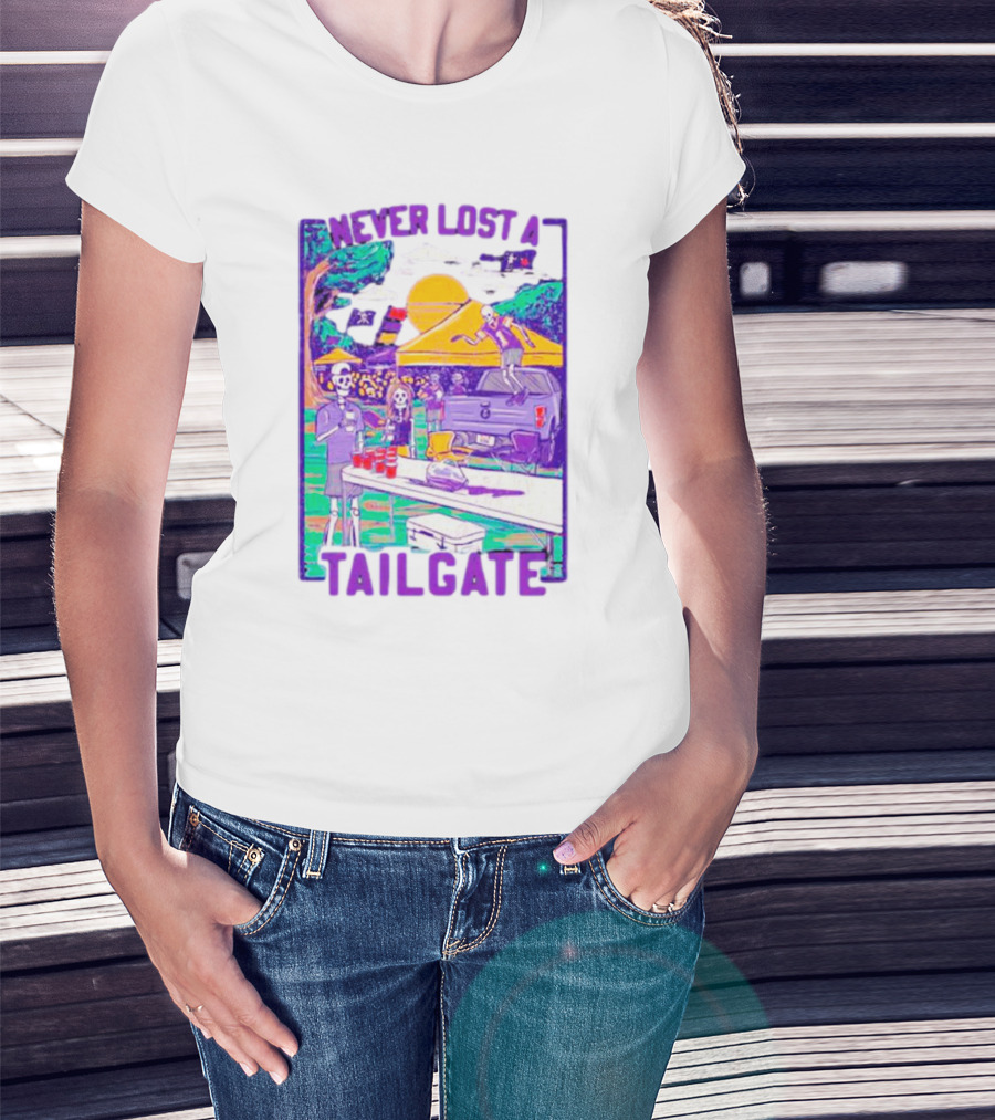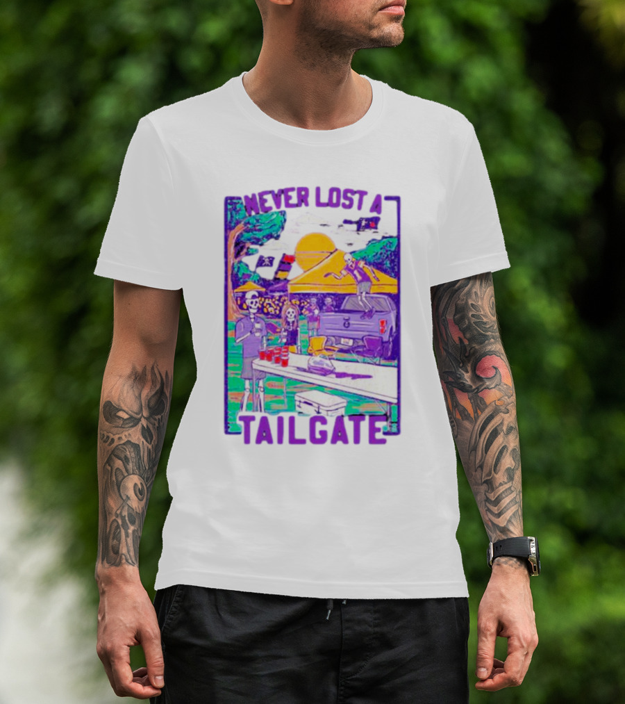 The East Carolina Pirates Never Lost a Tailgate Skeleton Party Scene T-shirt is designed for everyday wear and a consistent fit. Fabric is pre-shrunk ring-spun cotton with durable stitching. See the size chart below for exact measurements.
