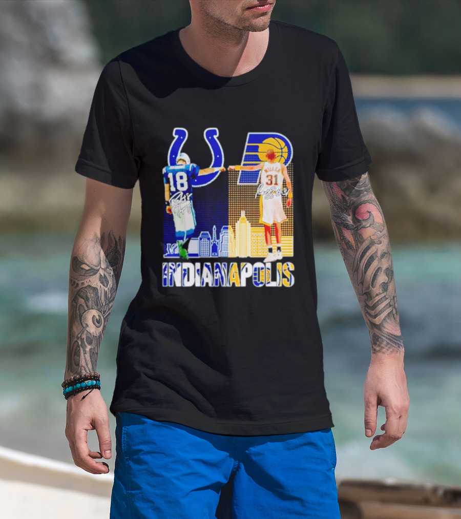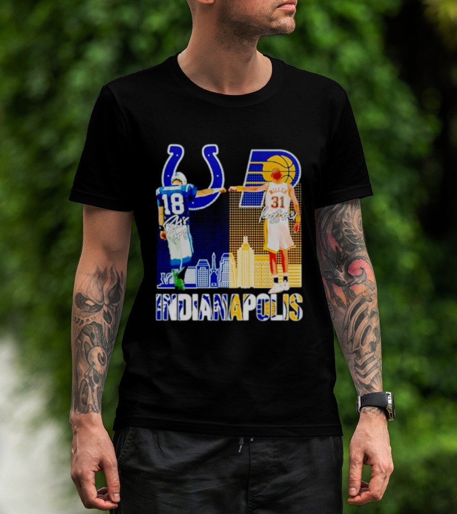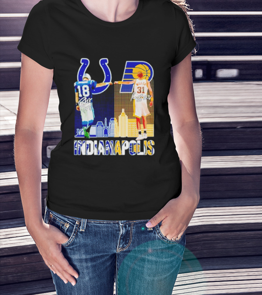 Indianapolis Colts Peyton Manning 18 Reggie Miller 31 Indiana Pacers Indianapolis Skyline T-Shirt