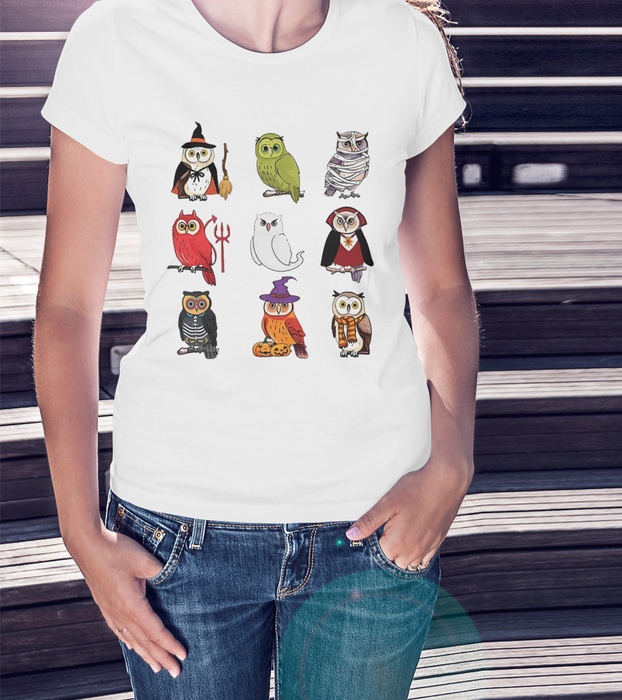 Cute Owls Halloween Witch Mummy Devil Skeleton Vampire Pumpkin Scarf T-Shirt