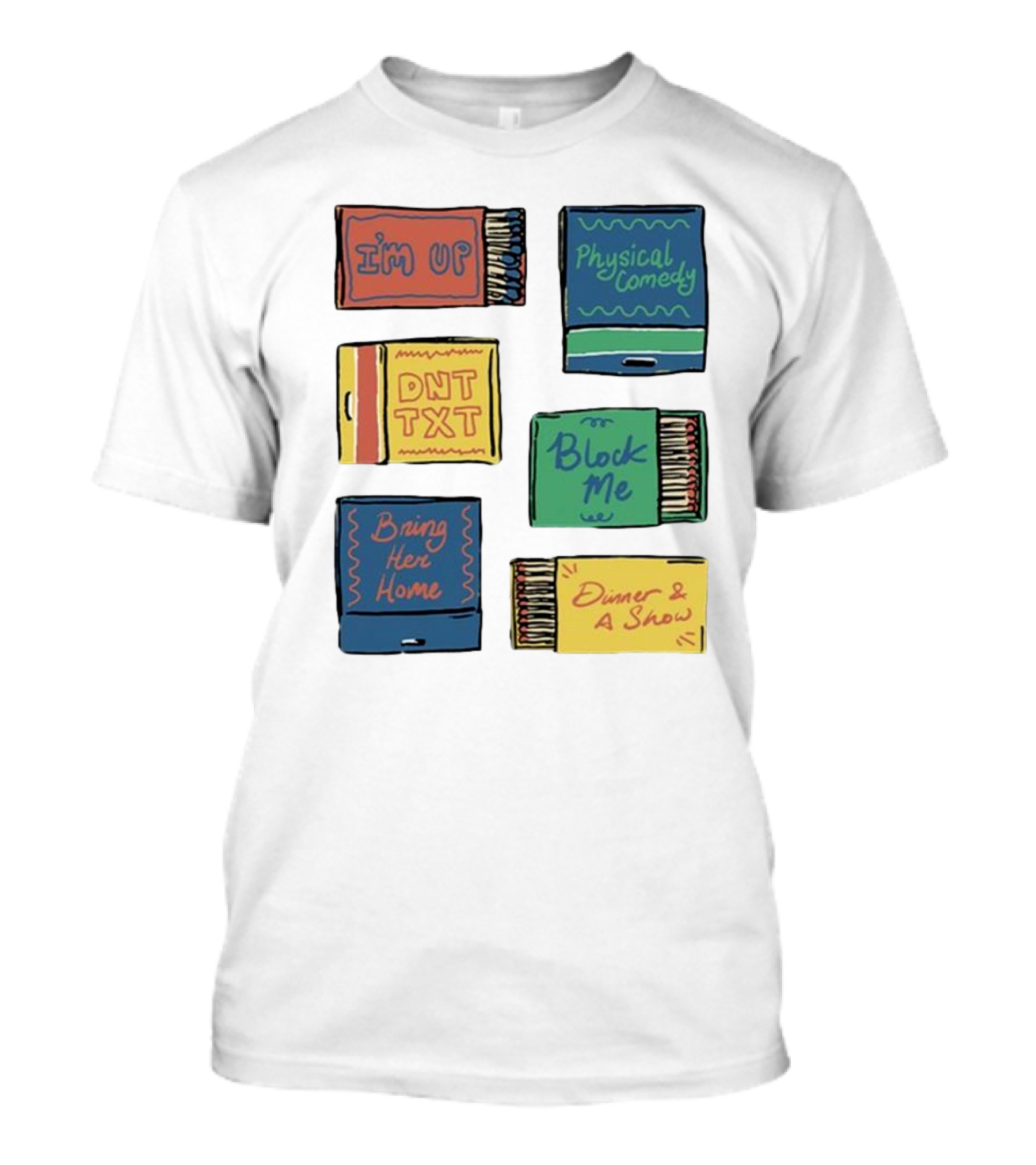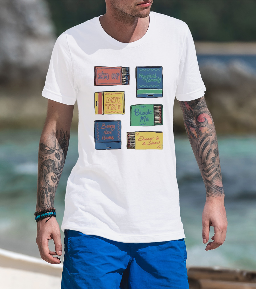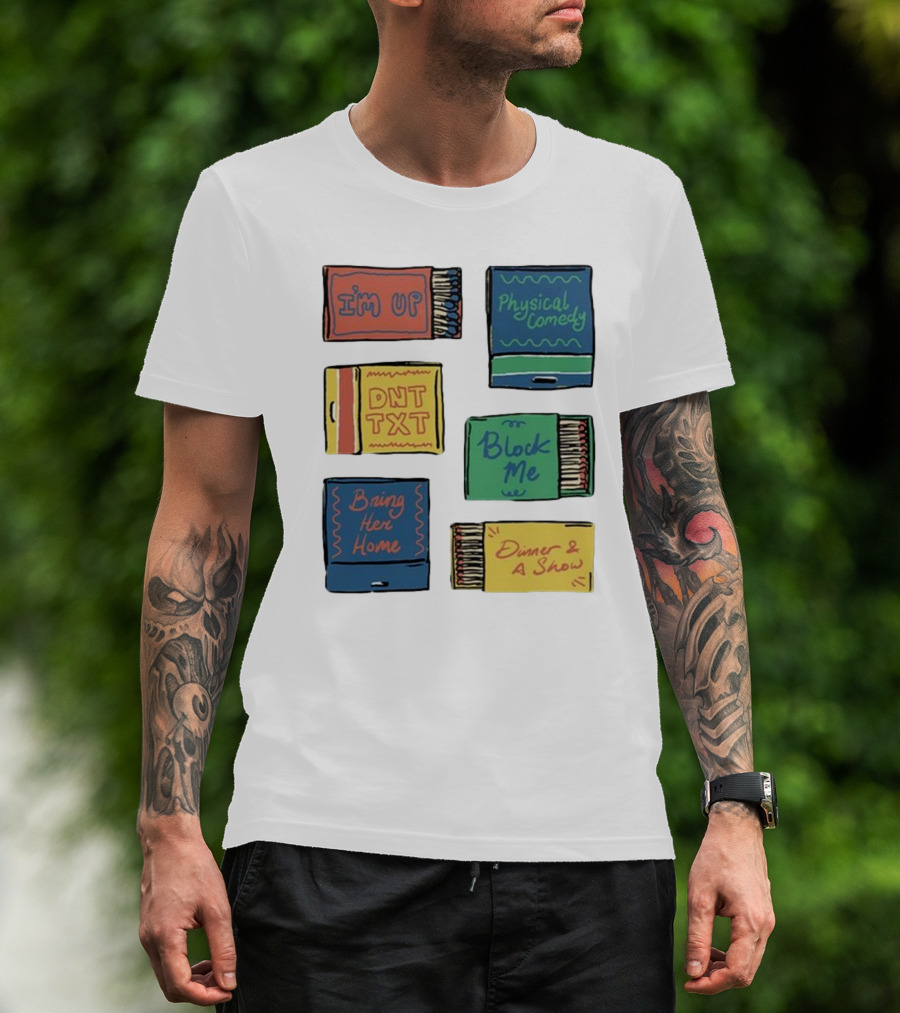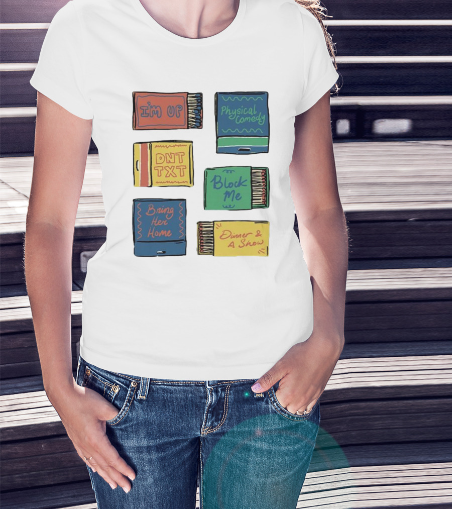 The I'm Up Physical Comedy DNT TXT Block Me Bring Her Home Dinner and A Show T-shirt is designed for everyday wear and a consistent fit. Fabric is pre-shrunk ring-spun cotton with durable stitching. See the size chart below for exact measurements.