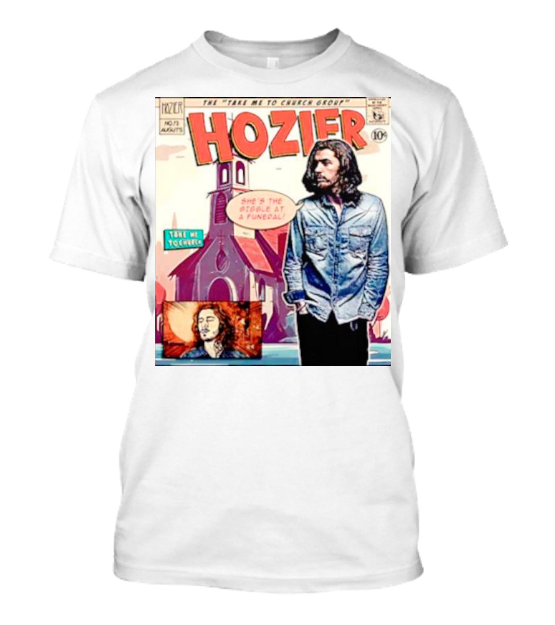 The Hozier The Take Me to Church Group Comic Style With Giggle at a Funeral Text T-shirt is designed for everyday wear and a consistent fit. Fabric is pre-shrunk ring-spun cotton with durable stitching. See the size chart below for exact measurements.
