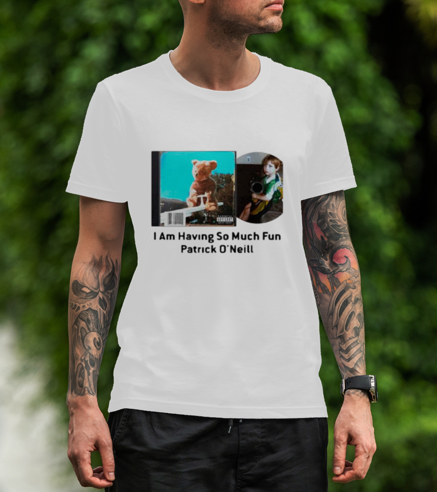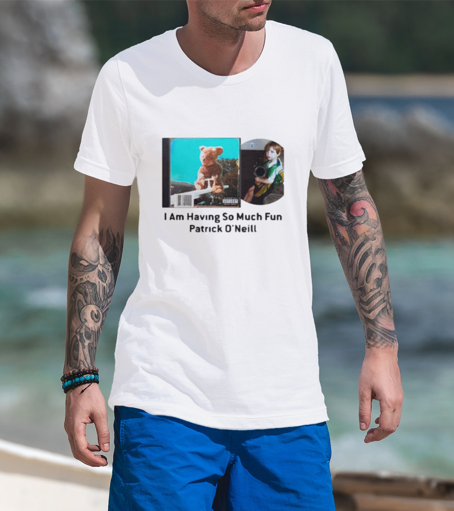 I Am Having So Much Fun Patrick O’Neill Teddy Bear Blue Background CD Boy With Toy T-Shirt