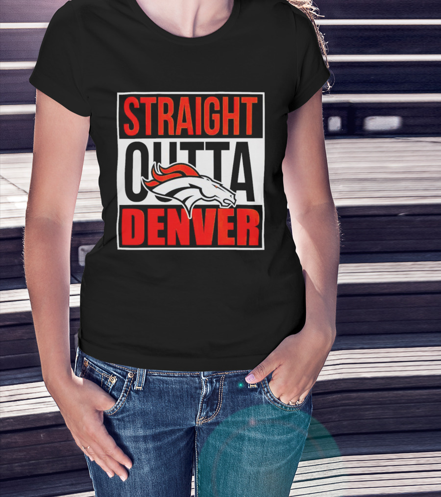 The Straight Outta Denver Broncos T-shirt is designed for everyday wear and a consistent fit. Fabric is pre-shrunk ring-spun cotton with durable stitching. See the size chart below for exact measurements.