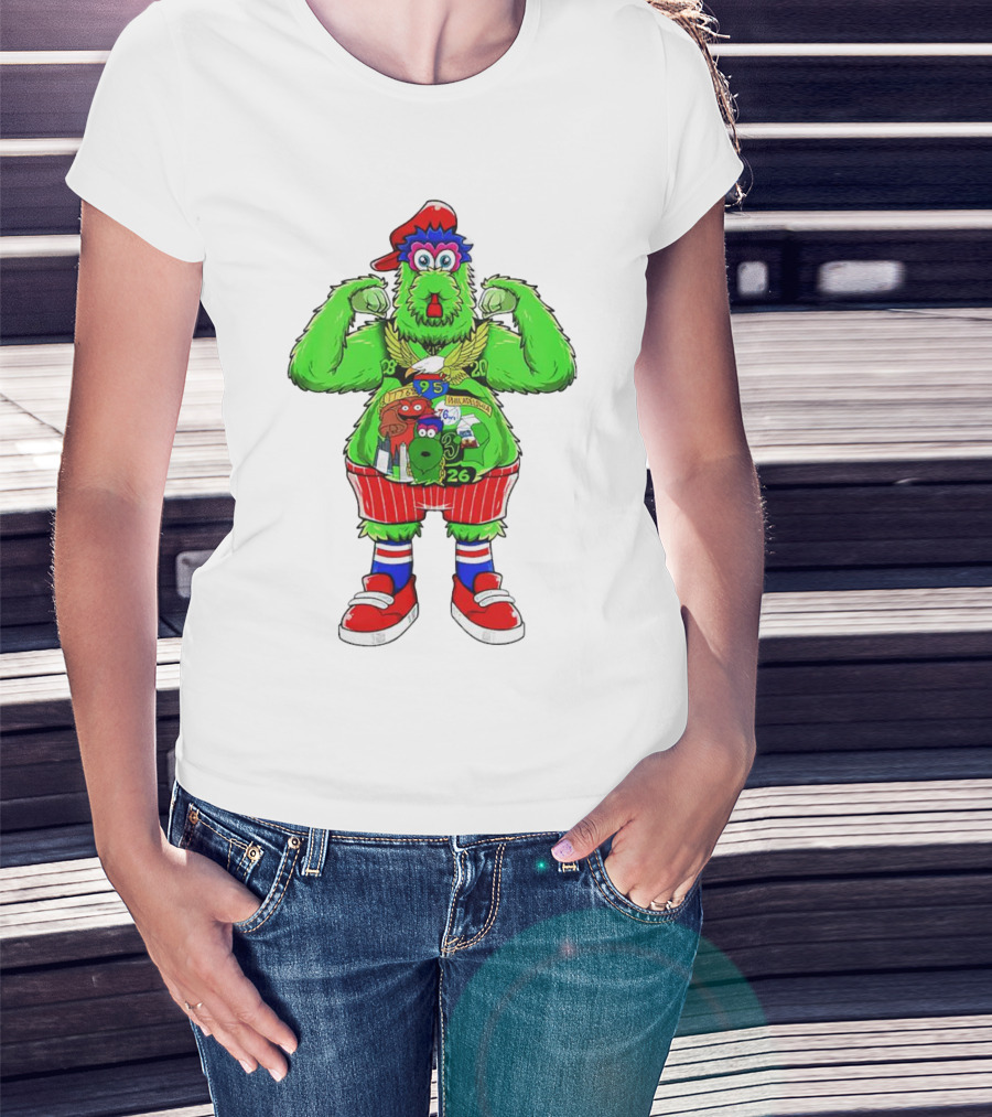 Philly Phanatic Mascots Sporting Red Cap And Sneakers With 1980 2008 1985 1995 2008 Numbers T-Shirt
